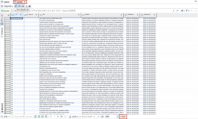 実行後の posts テーブルに、1000件のダミーデータ が挿入されている