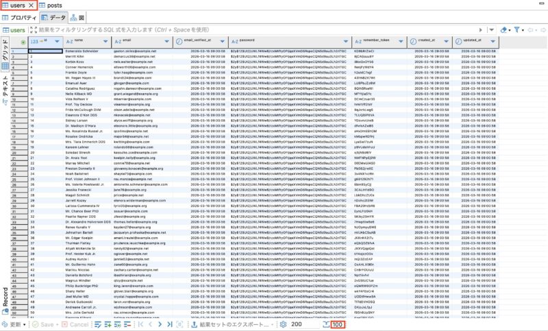 実行後の users テーブルに 100件のダミーデータ が挿入されている
