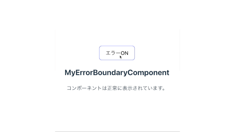 3. リセット(エラーOFF)」ボタンを押すと、再び「MyErrorBoundaryComponent」と「コンポーネントは正常に表示されています」と「エラーON」のボタンが表示される