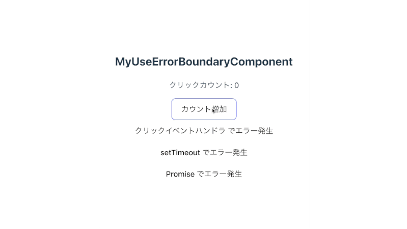 1. MyUseErrorBoundaryComponent」と「クリックカウント: 0」、「カウント増加」ボタン、「クリックイベントハンドラ でエラー発生」ボタン、「setTimeout でエラー発生」ボタン、「Promise でエラー発生」のボタンが表示される