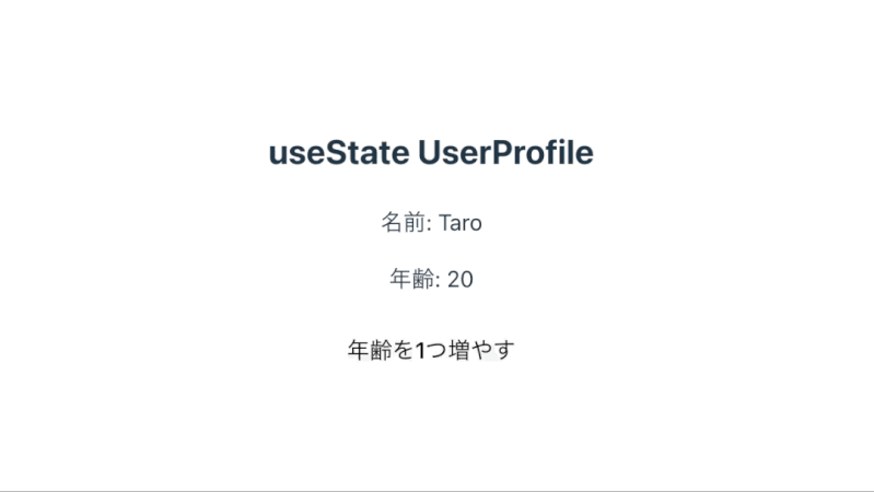 userの初期値を {name: ‘Taro’, age: 20}に設定 - 「年齢を1つ増やす」ボタンをクリックする たびに、