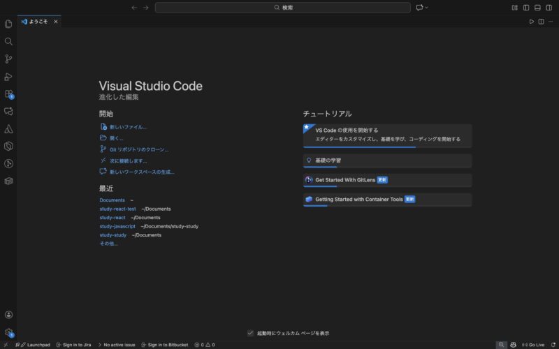 Visual Studio Code(VS Code)インストール後の画面 ※日本語パック導入済み