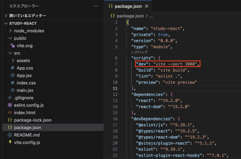 ①「pakage.json」ファイルの”scripts“の”dev“を”vite – – port 3000“に修正し、保存